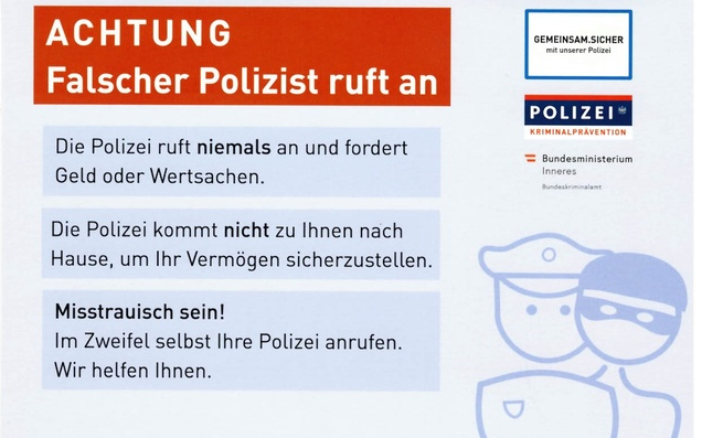 • Die Polizei ruft niemals an und fordert Geld oder Wertsachen.