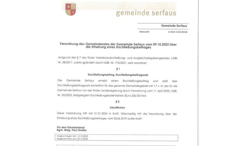 Verordnung des Gemeinderates der Gemeinde Serfaus vom 09.10.2023 über die Erhebung des Erschließungsbeitrages