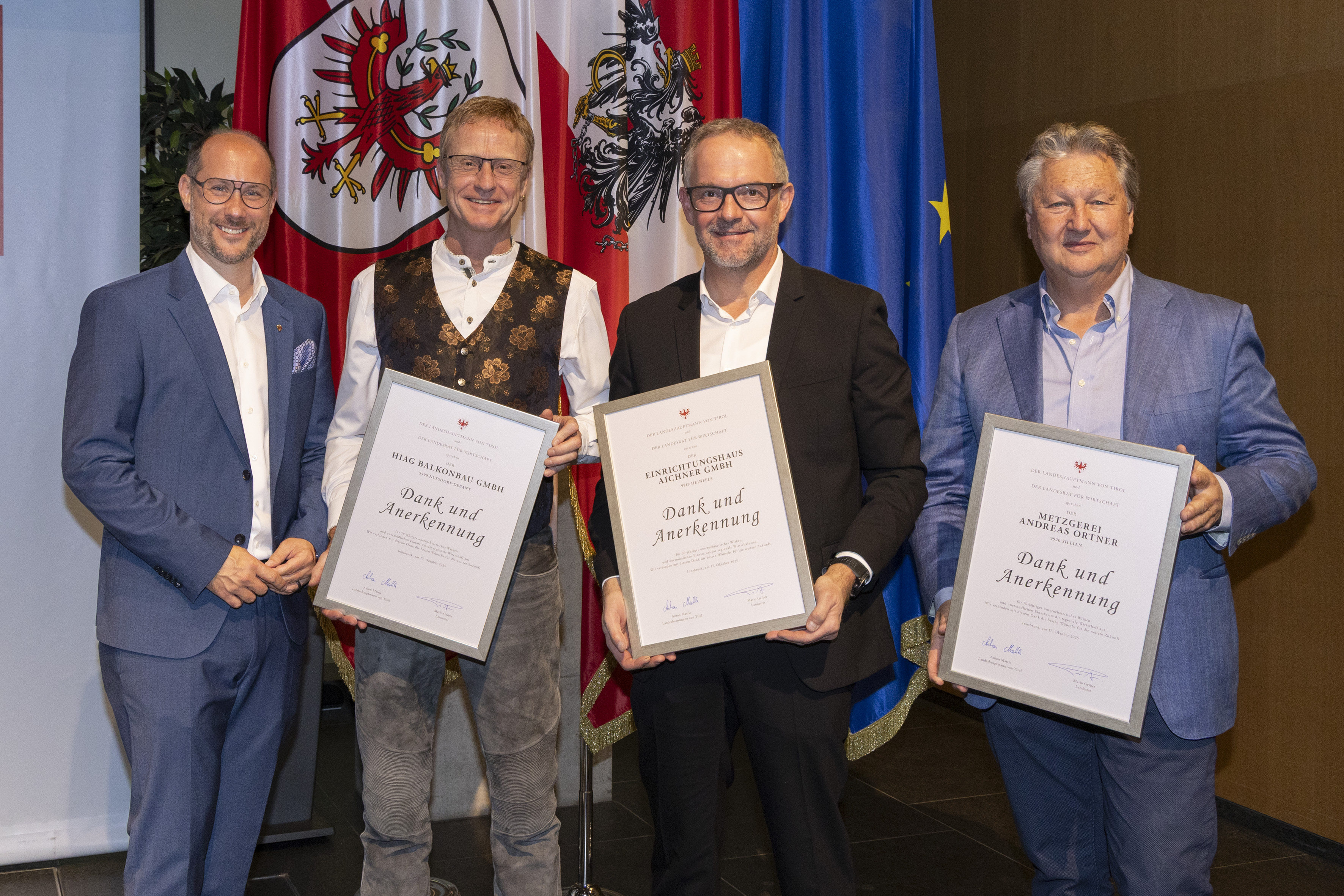 Wirtschaftslandesrat Mario Gerber überreichte die Urkunden als Anerkennung des Landes Tirol für ihre Verdienste um die heimische Wirtschaft.