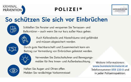 Weitere Informationen erhalten Sie auf der Homepage des Bundeskriminalamtes unter www.bundeskriminalamt.at, unter der Telefonnummer +43591330 und in jeder Polizeiinspektion.