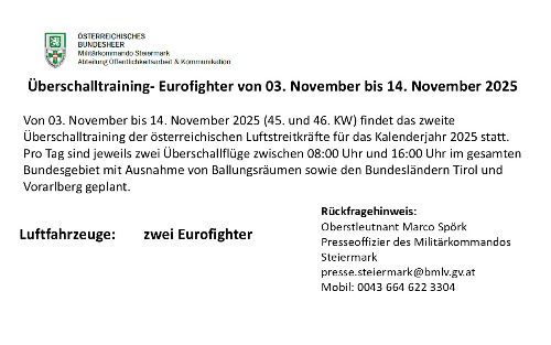 Von 03. November bis 14. November 2025 (45. und 46. KW) findet das zweite Überschalltraining der österreichischen Luftstreitkräfte für das Kalenderjahr 2025 statt. Pro Tag sind jeweils zwei Überschallflüge zwischen 08:00 Uhr und 16:00 Uhr im gesamten Bundesgebiet mit Ausnahme von Ballungsräumen sowie den Bundesländern Tirol und Vorarlberg geplant.