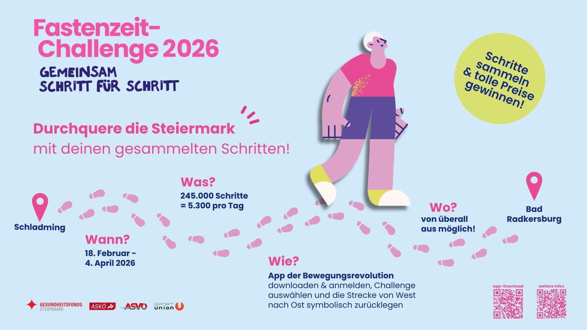 Die Fastenzeit ist mehr als Verzicht – sie ist deine Chance für neue, gesunde Gewohnheiten! Von 18. Februar bis 4. April sammeln wir gemeinsam Schritte und durchqueren symbolisch die Steiermark – von West nach Ost oder von Nord nach Süd.